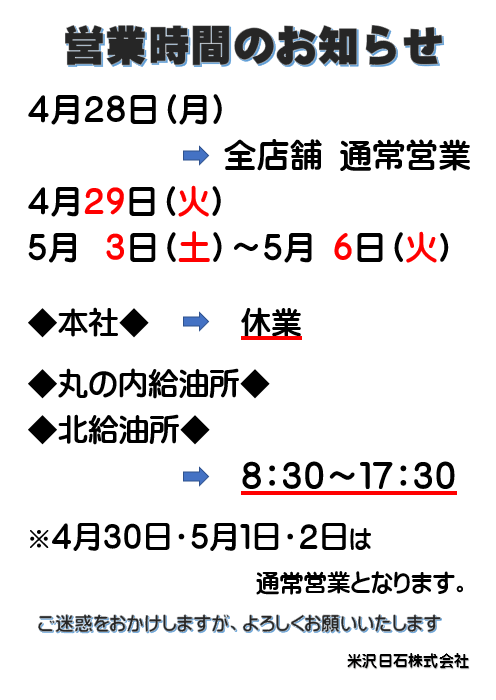 お盆期間中の給油には、米沢丸の内SS・米沢北SSをどうぞご利用ください。