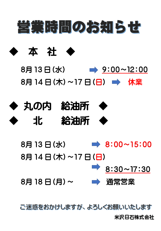 お盆休みの営業時間のお知らせです。本社とスタンドでは営業時間が異なりますので、ご注意ください。