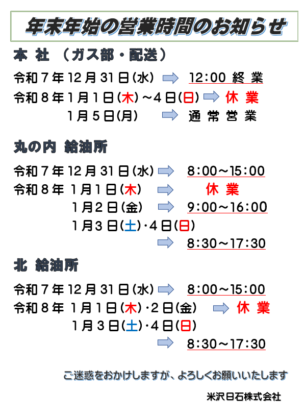 米沢日石株式会社は ガソリン、灯油、軽油、ガス、家電製品、中古車などを販売する、地域に根差した企業です。お問い合わせはメニューから。